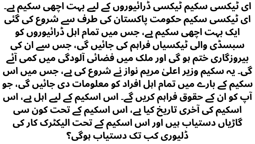 E-Taxi Scheme is a very good schemes for taxi drivers.The e-Taxi Scheme is a very good scheme launched by the Government of Pakistan, in which all eligible drivers will be provided with subsidized taxis, which will end their unemployment and reduce air pollution in the country.This scheme has been launched by Chief Minister Maryam Nawaz, in which all eligible people will be given their rights.In this article, you will get information about this scheme – who is eligible for this scheme, what is the last date of this scheme, which vehicles are available under this scheme and till when will the delivery of the electric car be available under this scheme?