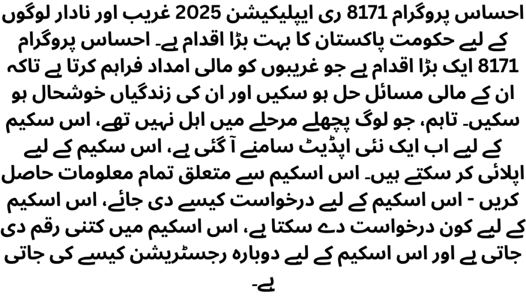 Ehsaas Program 8171 Re-Application 2025 is very big initiative of government of Pakistan for poor and needy people.Ehsaas Program 8171 is a major initiative that provides financial assistance to the poor so that their financial problems can be resolved and their lives can be prosperous.However, those who were not eligible in the previous phase can now apply for this scheme because a new update of this scheme has come out.In this article, you will get all the information related to this scheme – how to apply for this scheme, who can apply for this scheme, how much money is given in this scheme and how to re-register for this scheme.