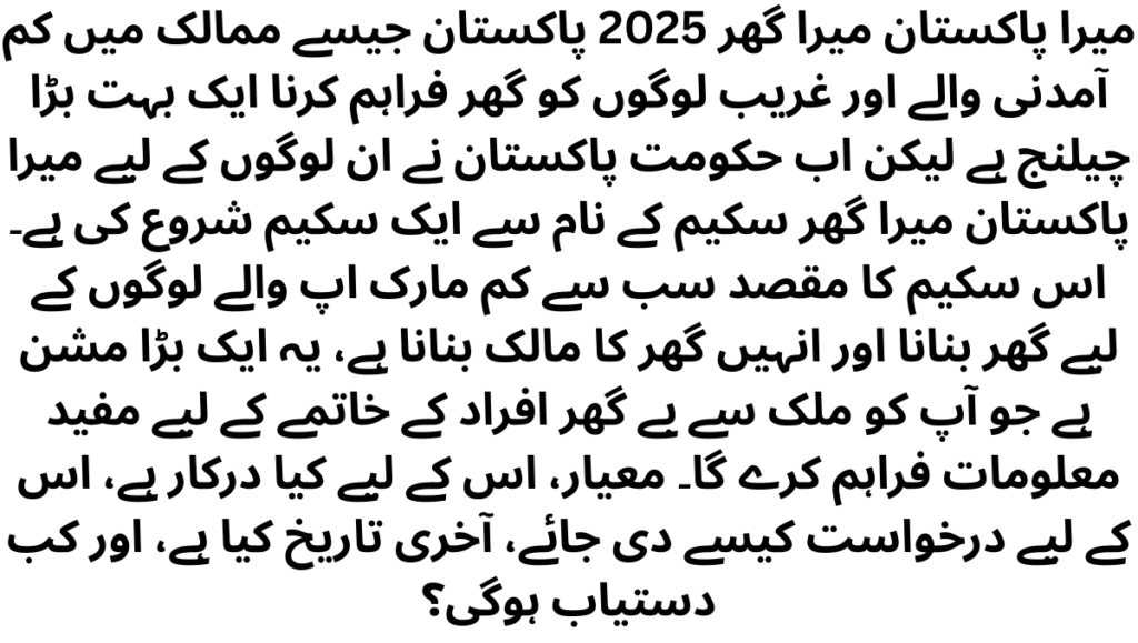 Mera Pakistan Mera Ghar 2025 in Pakistan like countries providing houses to low-income and poor people in the country is a very big challenge, but now the government of Pakistan has launched a scheme for these people called Mera Pakistan Mera Ghar Scheme.The aim of this scheme is to build houses for people with the lowest markup and make them homeowners, a major mission to eliminate homeless people from the country.In this article, you will find useful information – what is the eligibility criteria, what is required for it, how to apply for it, what is the last date, and when will it be available?