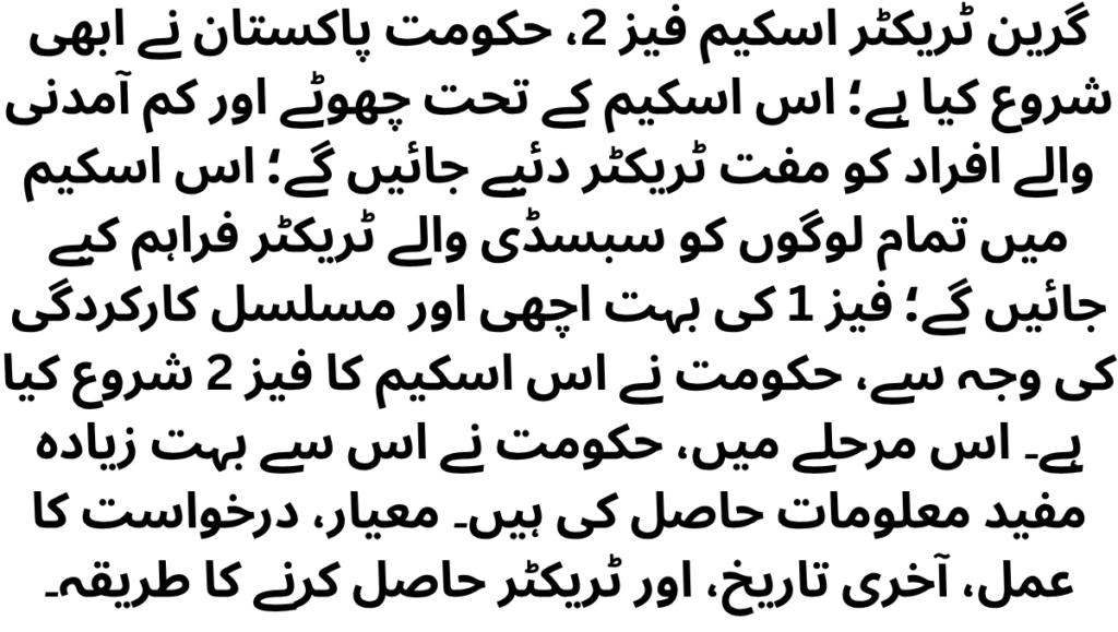 Green Tractor Scheme Phase 2,The government of Pakistan has started yet.Small and low-income earners will be given free tractors under this scheme.In this scheme, all people will be provided with subsidized tractors.Due to the very good and consistent performance of Phase 1, the government has launched Phase 2 of this scheme.In this phase, the government has benefited even more people.This article has a lot of useful information on it – eligibility criteria, application process, deadline, and how to get the tractor.