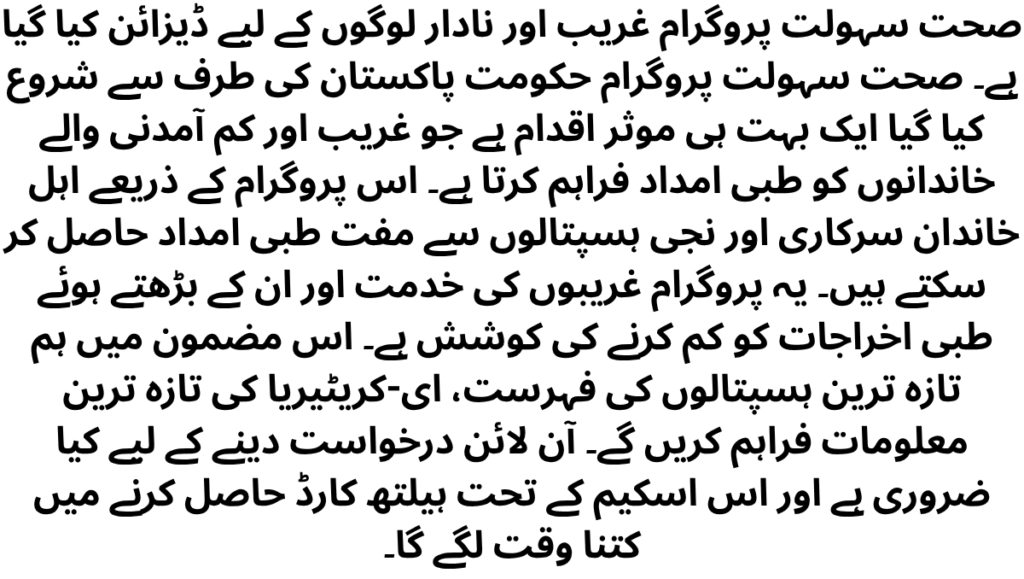 Sehat Sahulat Program is designed for poor and needy people.Sehat Sahulat Program is a very effective initiative launched by the Government of Pakistan that provides medical assistance to poor and low-income families.Through this program, eligible families can receive free medical care from government and private hospitals.This program is an attempt to serve the poor and reduce their rising medical expenses.In this article, we will provide the latest updates like eligibility criteria, hospital lists, what is required to apply online and how long will it take to get the health card under this scheme.
